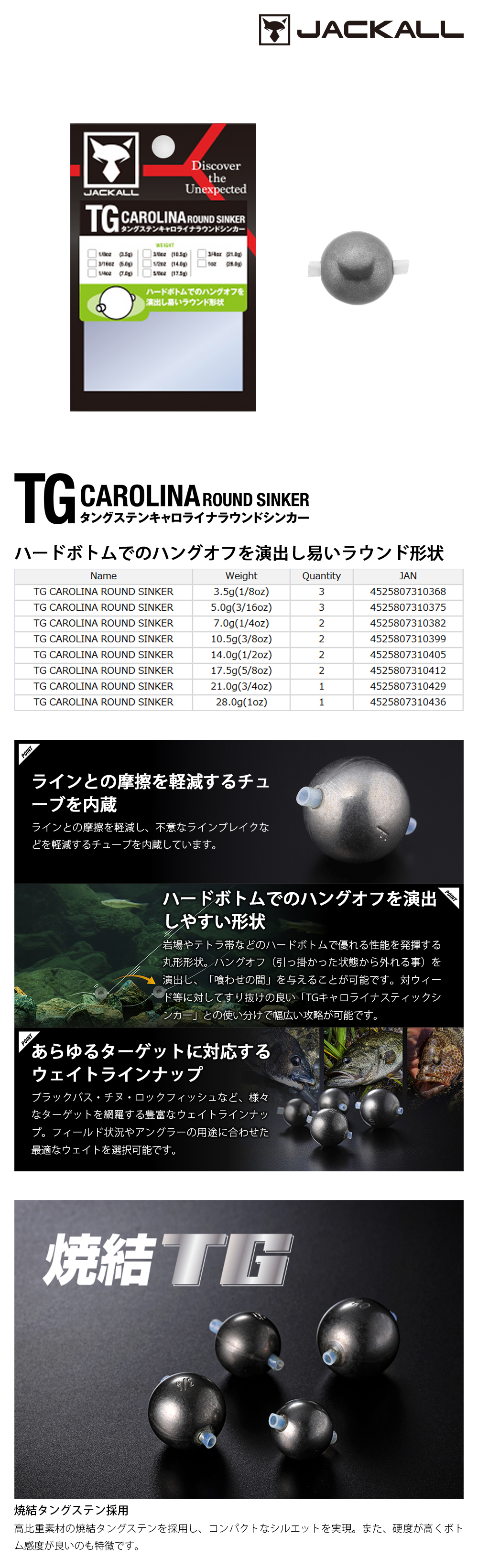 採用圓球形狀,在岩石區或消波塊等硬底地形能發揮卓越性能。其設計核心在於「彈脫(Hang-off)」—也就是讓鉛頭從卡住的縫隙中順勢撥開脫離。這個瞬間產生的位移能創造出「就餌空間」,誘發魚類攻擊。提供豐富的重量選擇,從淡水黑鱸到海水黑鯛、根魚等各種目標魚種皆能廣泛對應。