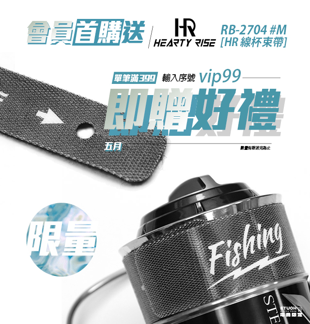 活動內容: 會員當月首筆購物,且滿$399 結帳時在折扣碼欄位輸入「vip99」 即贈 HR 線杯束帶 RB-2704 乙個! 相關說明: 五月限定活動 贈品數量有限,送完為止(不另外通知) 訂單取消、退貨不再補贈 每位會員首購禮限領一次 漁拓釣具官方線上購物限定 漁拓企業擁有活動異動和終止權利 ▶ 點我立刻加入會員 ◀