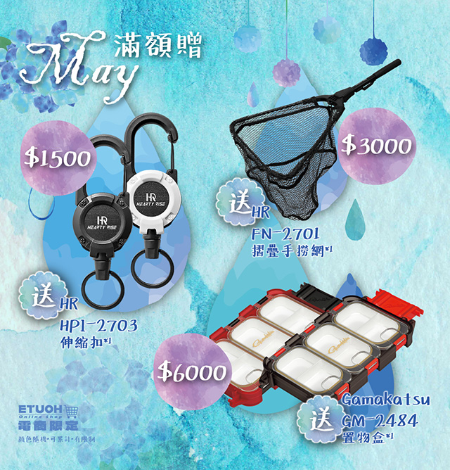 活動內容: 會員3月單筆結帳 滿$1,500贈 HR 登山扣式 伸縮扣 HPI-2703 乙個 滿$3,000贈 HR 折疊手撈網FN-2701 乙個 滿$6,000贈 がま 置物盒 GM-2484 乙個 相關說明: 5月限定活動 贈品數量有限,送完為止(不另外通知) 訂單取消、退貨需連同贈品退回 贈品顏色、款式隨機 贈品不累計! 實際款式贈送以出貨為主 漁拓企業擁有活動異動和終止權利